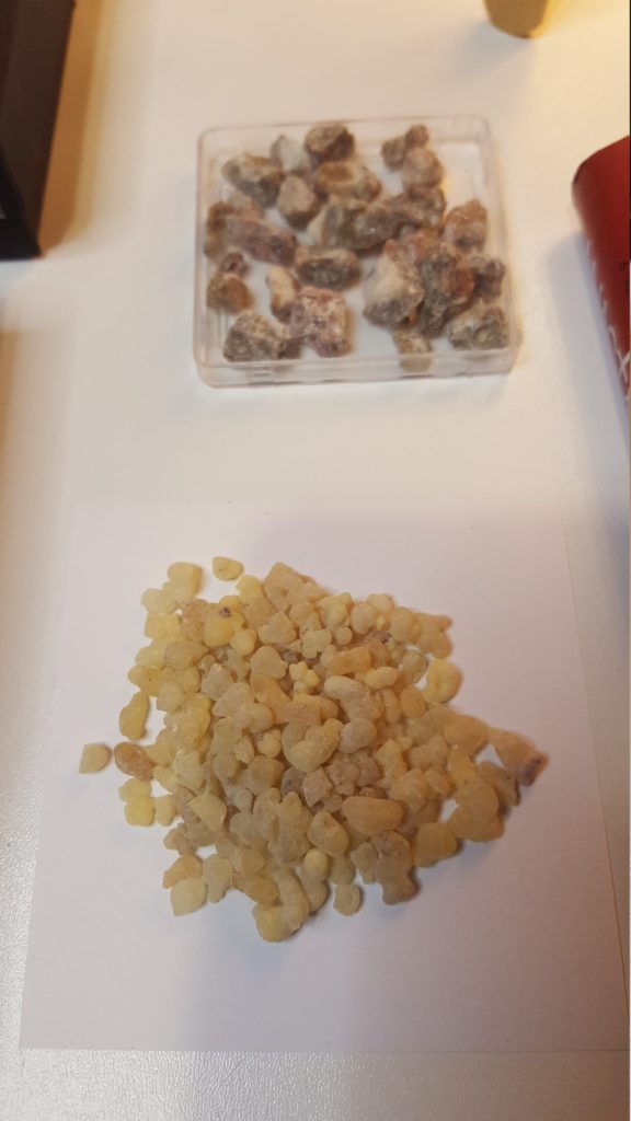 - Rasina de Smirna naturala (min. 10 g). Smirna provine din seva unui arbore pitic, denumit Commiphora Myrrha. Arbustul cu seva frumos mirositoare crește doar în câteva regiuni restrânse și aride din Kenya, Oman, Etiopia, Somalia și Arabia Saudită. Din această cauză, smirna naturală este destul de rară și și mai pretioasa decât tămâia. Provenienta Grecia. [spirit, corp | miros].